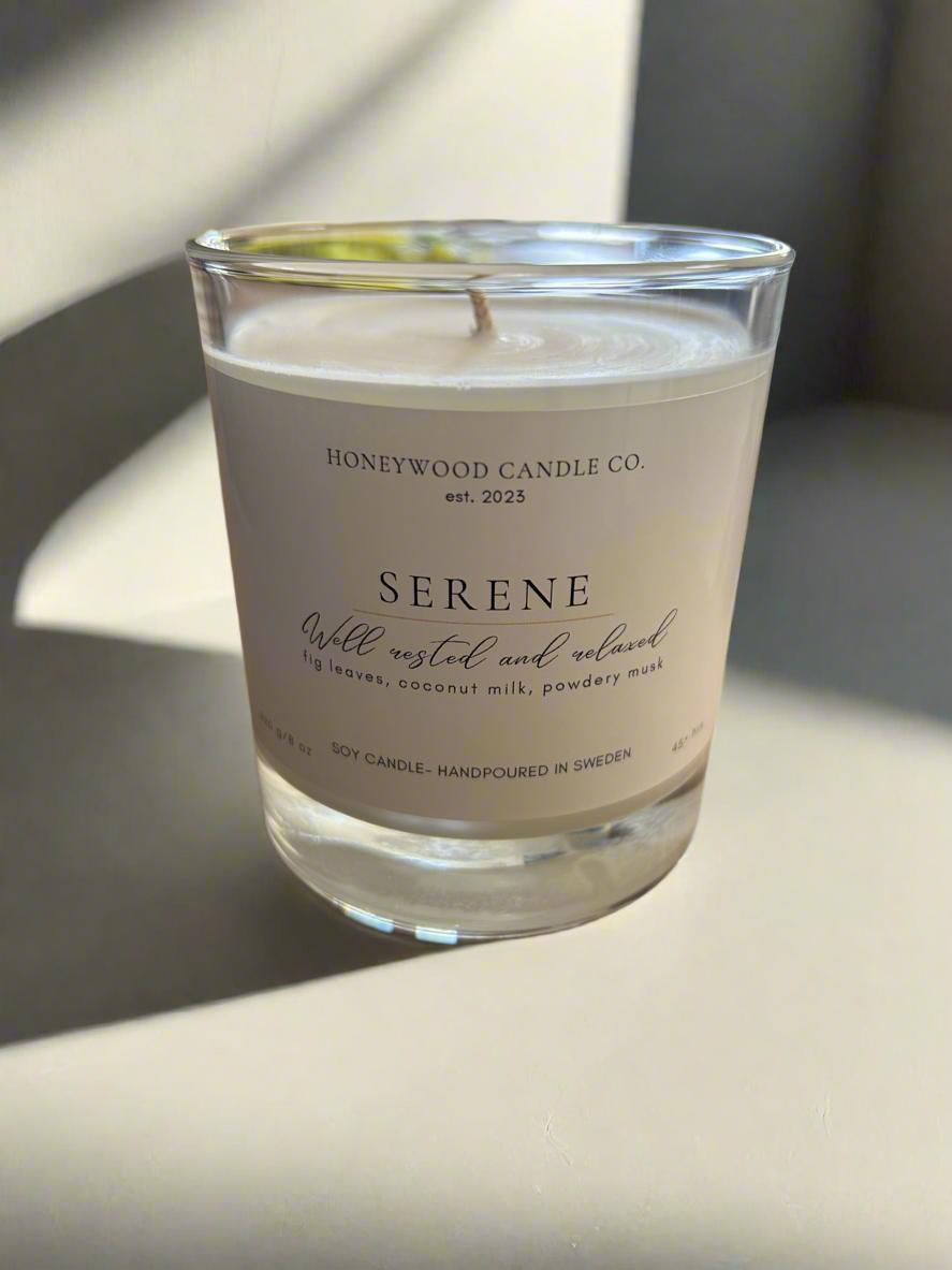 Experience the feeling of a calm and tranquil, sunlit morning with Honeywood's Serene candle.